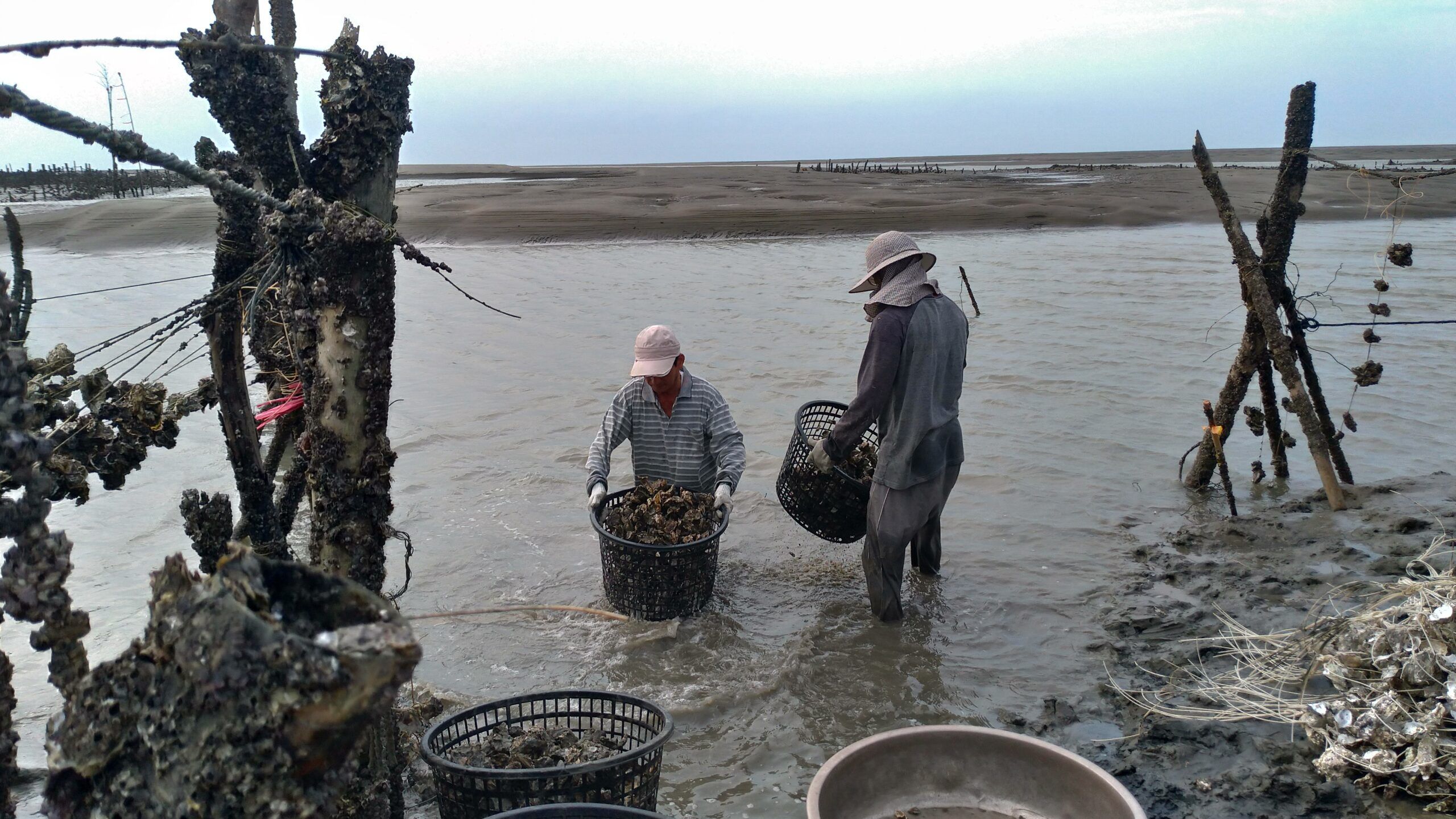林大哥提到,雖然家庭經濟曾經比較吃緊,但三個孩子看到他們每天海洋退潮後,到水深及胸的蚵田工作,採蚵、疏蚵苗,甚至是汰換蚵棚架的竹子;回來後來要挖蚵、串蚵殼、販售;遇到每年夏天到中秋節前的採收旺季,更是沒有休息時間,連孩子都要跟著他們一起挖蚵、賣蚵。聽到這裡,感受到養蚵對林大哥來說,是養活一大家子的驕傲,是養育出善良、獨立孩子的自豪。